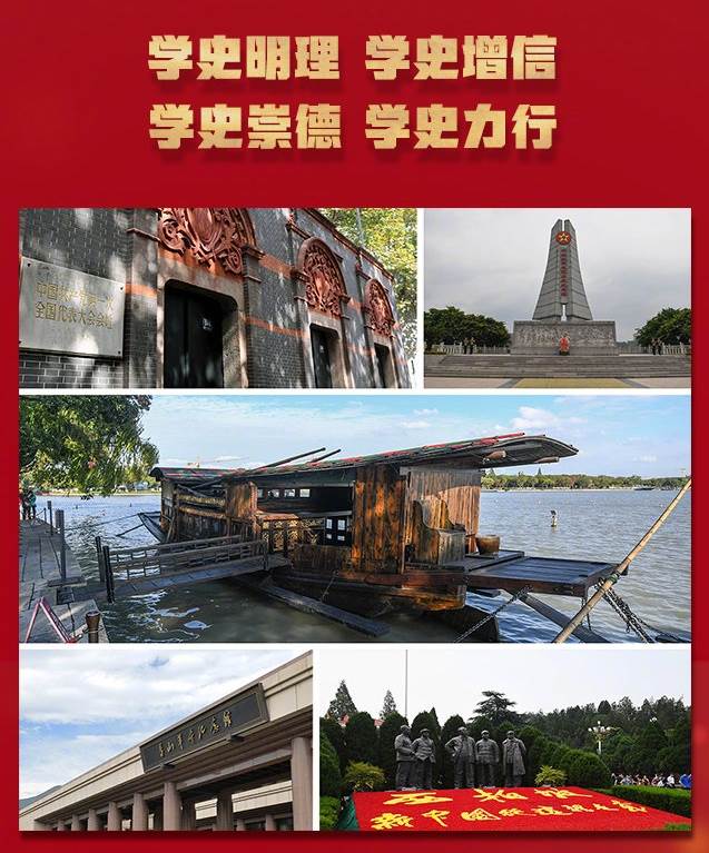 當天晚上,中國共產(chǎn)黨第一次全國代表大會就正式開幕了。現(xiàn)在上海市興業(yè)路76號,就是當時一大的會址,當時是上海法租界望志路106號。各地黨組織派出的13名代表出席會議。共產(chǎn)國際代表馬林首先致辭,對中國共產(chǎn)黨成立表示祝賀。第二天,各地代表分別報告本地區(qū)黨、團組織情況。25日和26日休會兩天,起草供會議討論的黨綱和工作計劃。27日、28日和29日,連續(xù)三天舉行三次會議,對黨的綱領(lǐng)和決議進行了詳盡的討論。30日晚,因一名神秘男子的突然闖入而終止會議,代表們分批轉(zhuǎn)移到浙江嘉興南湖的游船上繼續(xù)進行。嘉興南湖,由此成為中國共產(chǎn)黨揚帆起航的圣地。“紅船精神”也成為共產(chǎn)黨最具代表性的精神標識。