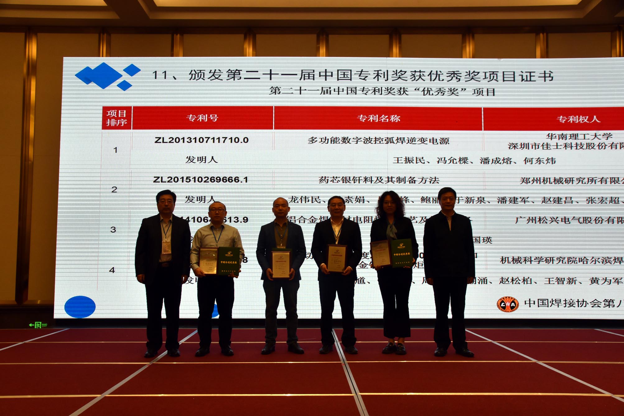 中國焊接協會會長俞培根、副會長楊玉亭分別為榮獲“第二十一屆中國專利優秀獎”的深圳市佳士科技股份有限公司、鄭州機械研究所有限公司、廣州松興電氣股份有限公司、哈爾濱焊接研究院有限公司,頒發了第二十一屆中國專利獎獲優秀獎項目證書。