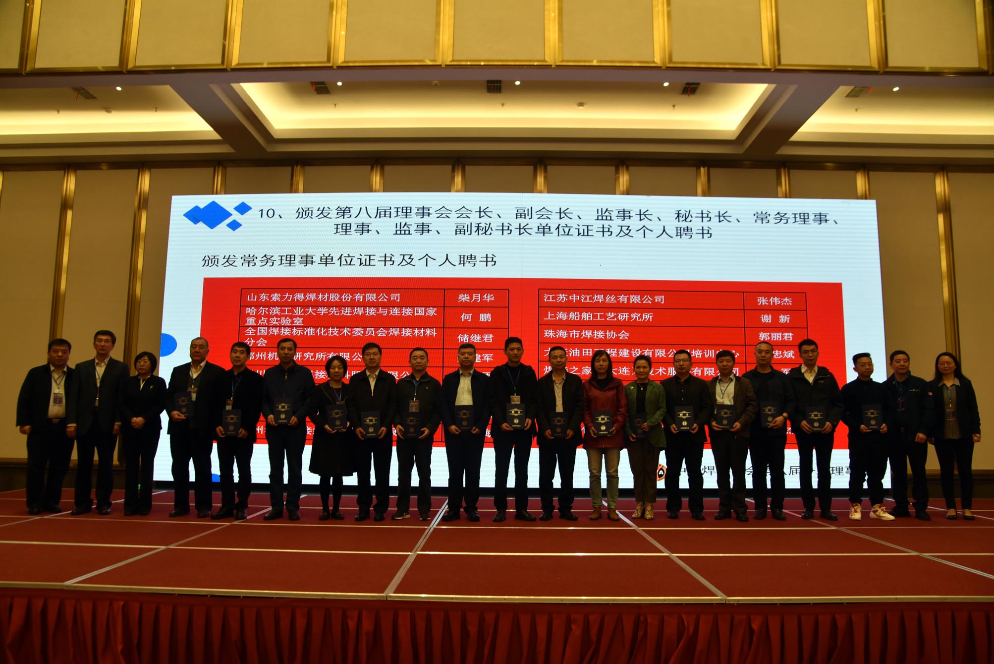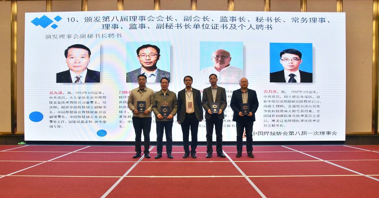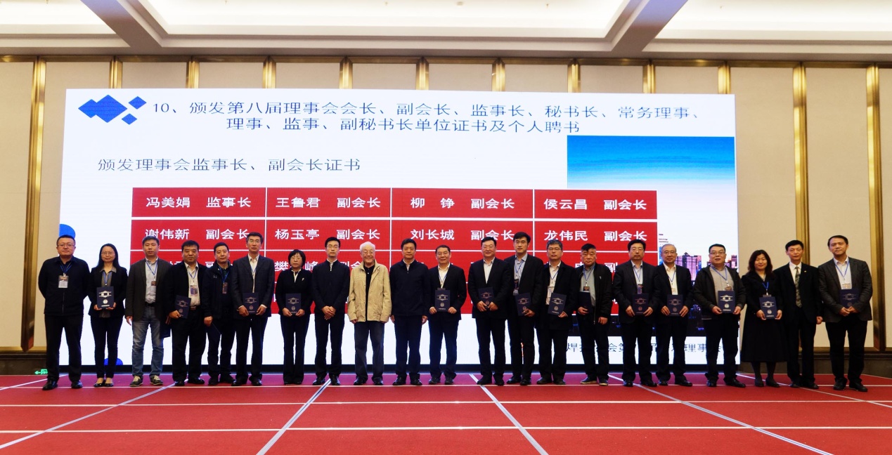 國資委協會黨建局裴毅東副處長、中國機械工業聯合會執行副會長趙馳、中國焊接協會會長俞培根為新任監事長馮美娟,副會長王魯君、龍偉民、葉德平、劉長城、劉申、李連勝、李東、楊玉亭、張寧紅、陳樹君、柳錚、侯云昌、袁兆富、魯彤、謝偉新、樊險峰頒發聘書。