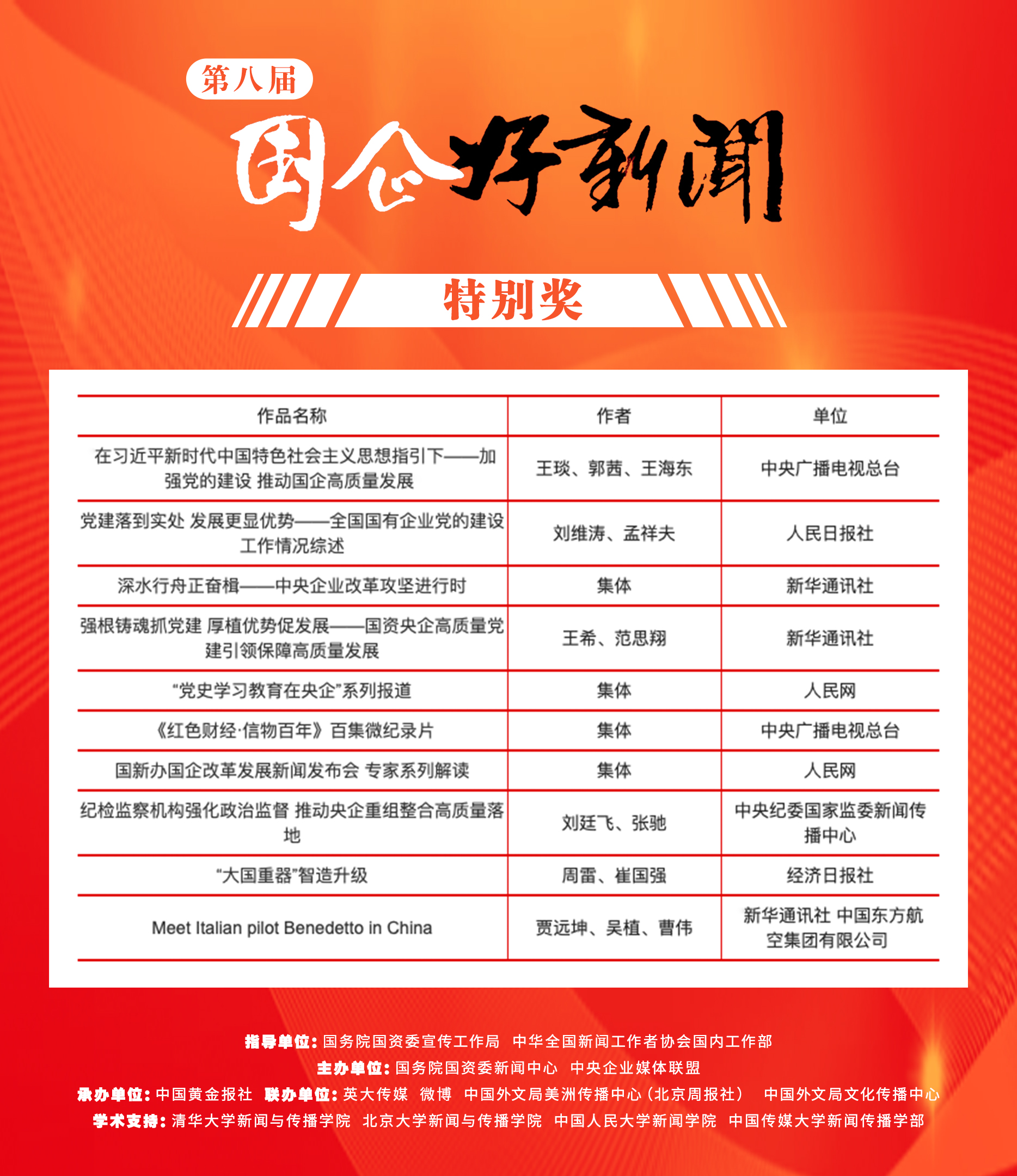 在國資委黨委的高度重視下,第八屆“國企好新聞”由國務院國資委宣傳工作局、中華全國新聞工作者協會國內工作部指導,國務院國資委新聞中心、中央企業媒體聯盟主辦,中國黃金報社承辦,英大傳媒、微博、中國外文局美洲傳播中心(北京周報社)、中國外文局文化傳播中心聯辦,清華大學新聞與傳播學院、北京大學新聞與傳播學院、中國人民大學新聞學院、中國傳媒大學新聞傳播學部提供學術支持。征集、評選歷時2個月,得到了國資國企、主流媒體、社會公眾的廣泛關注和積極參與,3772件新聞作品、73名新聞創客人選參評,138家國資國企單位報名,相比往屆量質齊升,社會影響力顯著增強。
