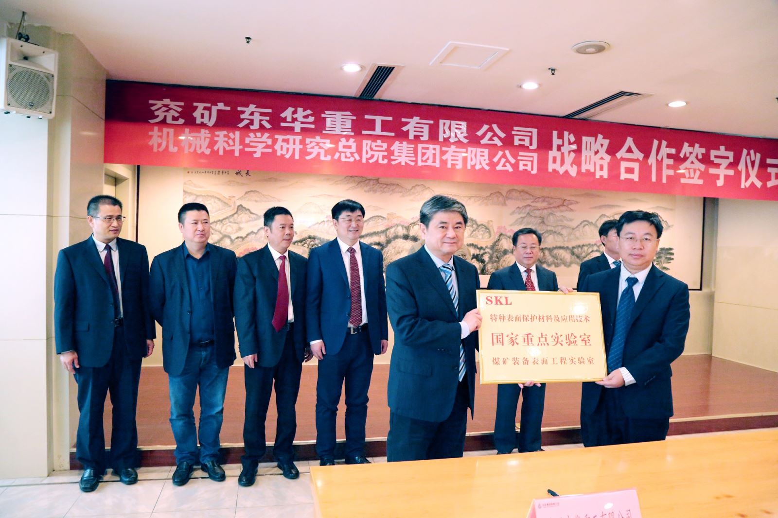 特種表面保護材料及應用技術國家重點實驗室在東華重工設立煤礦裝備表面工程實驗室,材保所總經(jīng)理吳勇授牌,趙峰代表東華重工接牌。