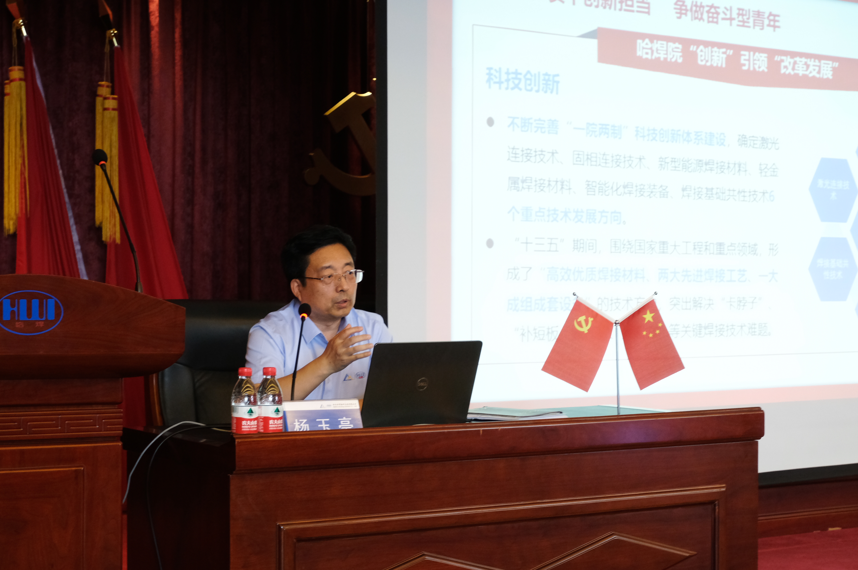 楊玉亭書記首先對(duì)習(xí)近平總書記“七一”重要講話精神及總書記在2021年中央黨校(國家行政學(xué)院)中青年干部培訓(xùn)班開班式上的講話進(jìn)行了宣講,引領(lǐng)青年回顧學(xué)習(xí)重要講話精神,堅(jiān)定信仰引航奮斗人生,筑牢思想政治基礎(chǔ),渲染青春底色。隨后,圍繞“把握政治建設(shè)內(nèi)涵 凝聚干事創(chuàng)業(yè)力量”,結(jié)合學(xué)習(xí)總書記關(guān)于加強(qiáng)思想政治建設(shè)的重要論述,激勵(lì)廣大青年干部堅(jiān)定理想信念,加強(qiáng)政治建設(shè),在不斷的學(xué)習(xí)與鍛煉中提升自己的干事創(chuàng)業(yè)能力,以實(shí)際行動(dòng)投身改革創(chuàng)新浪潮。最后楊書記結(jié)合哈焊院“創(chuàng)新”引領(lǐng)“改革發(fā)展”歷程及自身成長(zhǎng)經(jīng)歷,深刻闡釋了“使命擔(dān)當(dāng),青年任重道遠(yuǎn);機(jī)會(huì)空前,青年大有可為”,并對(duì)哈焊青年提出深切勉勵(lì)和殷切希望,號(hào)召廣大青年:堅(jiān)定理想信念 爭(zhēng)做學(xué)習(xí)型青年;實(shí)干創(chuàng)新?lián)?dāng) 爭(zhēng)做奮斗型青年;嚴(yán)格紀(jì)律約束 爭(zhēng)做先進(jìn)型青年。